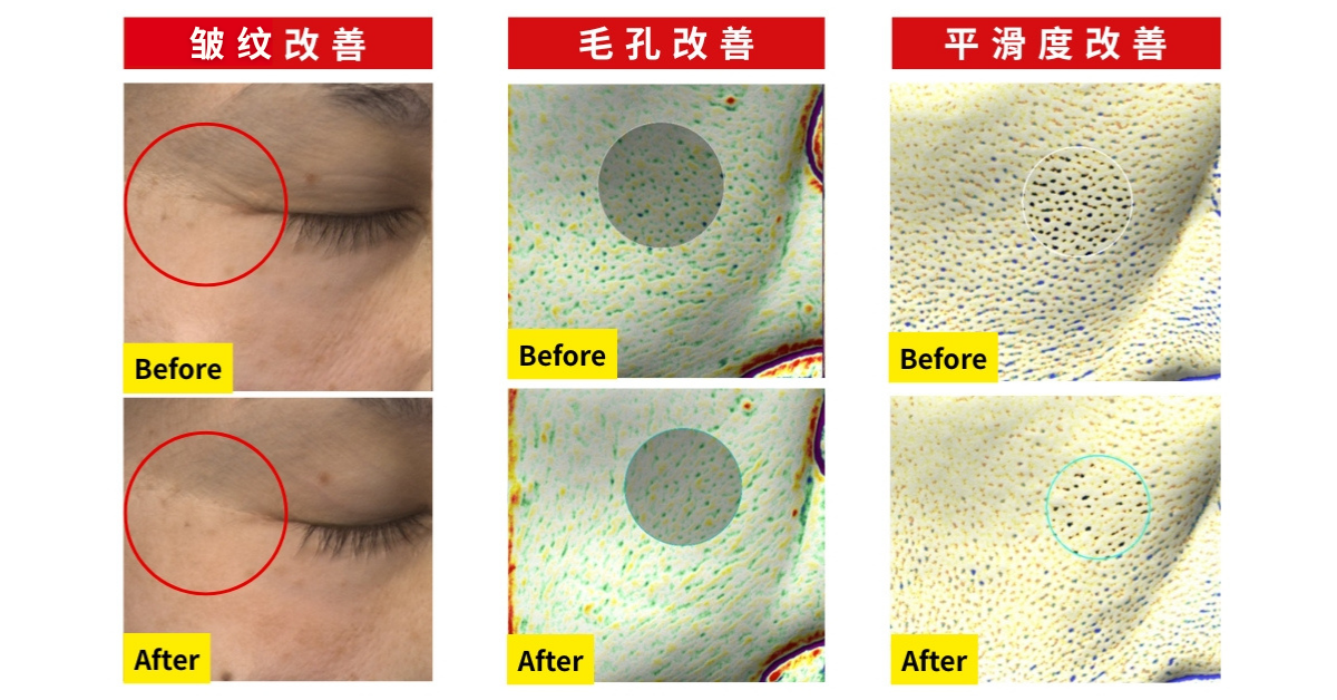 实验数据显示,连续使用4週后,受测者肌肤细纹显著改善,皱纹视觉面积平均减少 3.29%,眼角皱纹深度降低 0.025mm;仅10天即可见效,肌肤暗沉度获得明显改善,光泽度平均提升 0.53%。